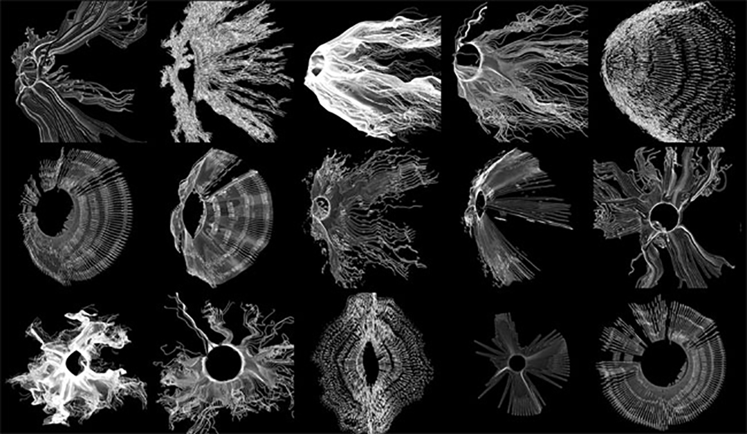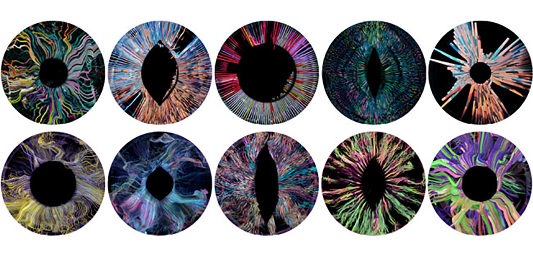 藝術(shù)家們創(chuàng)作的一系列數(shù)字雕塑為這一身份火上澆油。當(dāng)從正面看時,這些雕塑被設(shè)計(jì)成類似于一系列復(fù)雜的精細(xì)肌肉,這些肌肉的膨脹和收縮構(gòu)成了生物眼睛的虹膜。數(shù)據(jù)隨機(jī)化,給出了無限多的虹膜設(shè)計(jì)。
