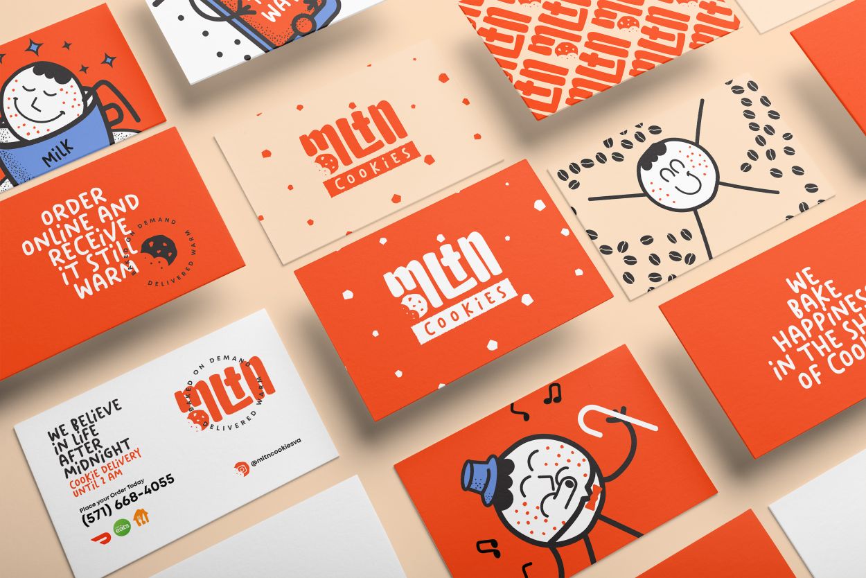 品牌形象設(shè)計(jì)中對(duì)于顏色,我們使用了充滿活力和冷色的組合。調(diào)色板保持復(fù)古,并且還與品牌的差異之一有關(guān),即直到凌晨 2 點(diǎn)才交付產(chǎn)品。我們使用了代表夜晚和夜空的藍(lán)色陰影。盡管有顏色,但它只是次要的,如果將來商業(yè)物流必須改變,你不會(huì)被它所束縛。
