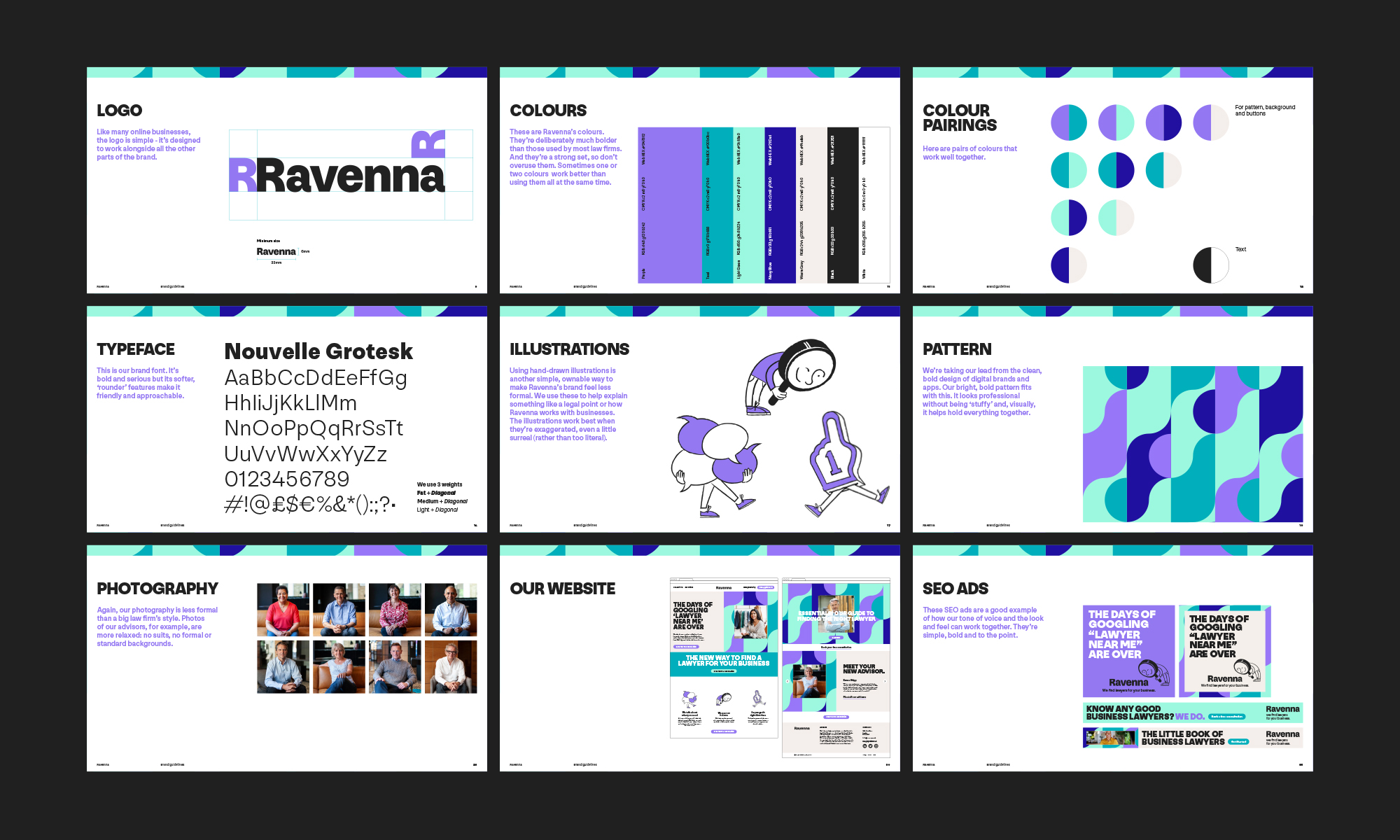 我們與超級(jí)語(yǔ)音專(zhuān)家 We All Need Words 合作,為 Ravenna 創(chuàng)建了一個(gè)大膽而引人入勝的視覺(jué)標(biāo)識(shí)設(shè)計(jì)。這是一個(gè)為通常被認(rèn)為是安全的世界創(chuàng)造新事物和有趣事物的機(jī)會(huì)。我們希望給 Ravenna品牌形象設(shè)計(jì) 一個(gè)既不同、獨(dú)特又多彩的外觀和感覺(jué),以幫助將一家律師事務(wù)所帶入數(shù)字世界,并避免與該行業(yè)相關(guān)的任何常見(jiàn)的刻板印象。由于這是針對(duì)新成立的企業(yè),它需要吸引新的和現(xiàn)代的觀眾,他們不怕與眾不同并探索新的途徑。