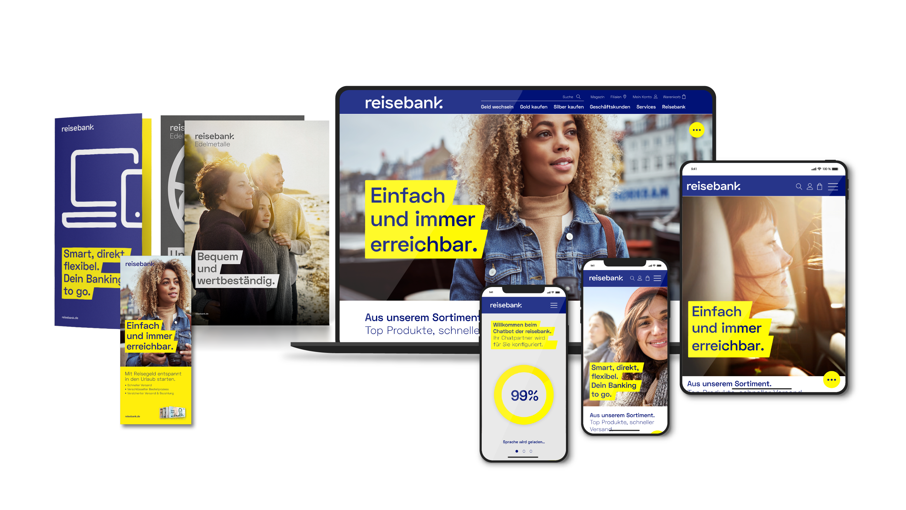 以全新方式體驗(yàn)市場(chǎng)領(lǐng)導(dǎo)者,多年來(lái),Reisebank AG 已成為德國(guó)旅行貨幣和外幣市場(chǎng)的領(lǐng)導(dǎo)者,如今已成為 DZ BANK 集團(tuán)以及合作金融集團(tuán)內(nèi)久經(jīng)考驗(yàn)的現(xiàn)金專家。隨著 Reisebank 的業(yè)務(wù)領(lǐng)域和服務(wù)范圍的逐步擴(kuò)展 - 除了與旅行相關(guān)的服務(wù) - 有針對(duì)性的升級(jí)和外觀現(xiàn)代化的潛力變得明顯 - 也是為了能夠在未來(lái)吸引特別苛刻的目標(biāo)群體,例如不同范圍的貴金屬。