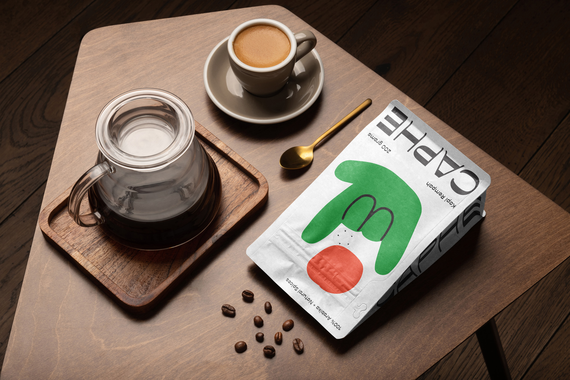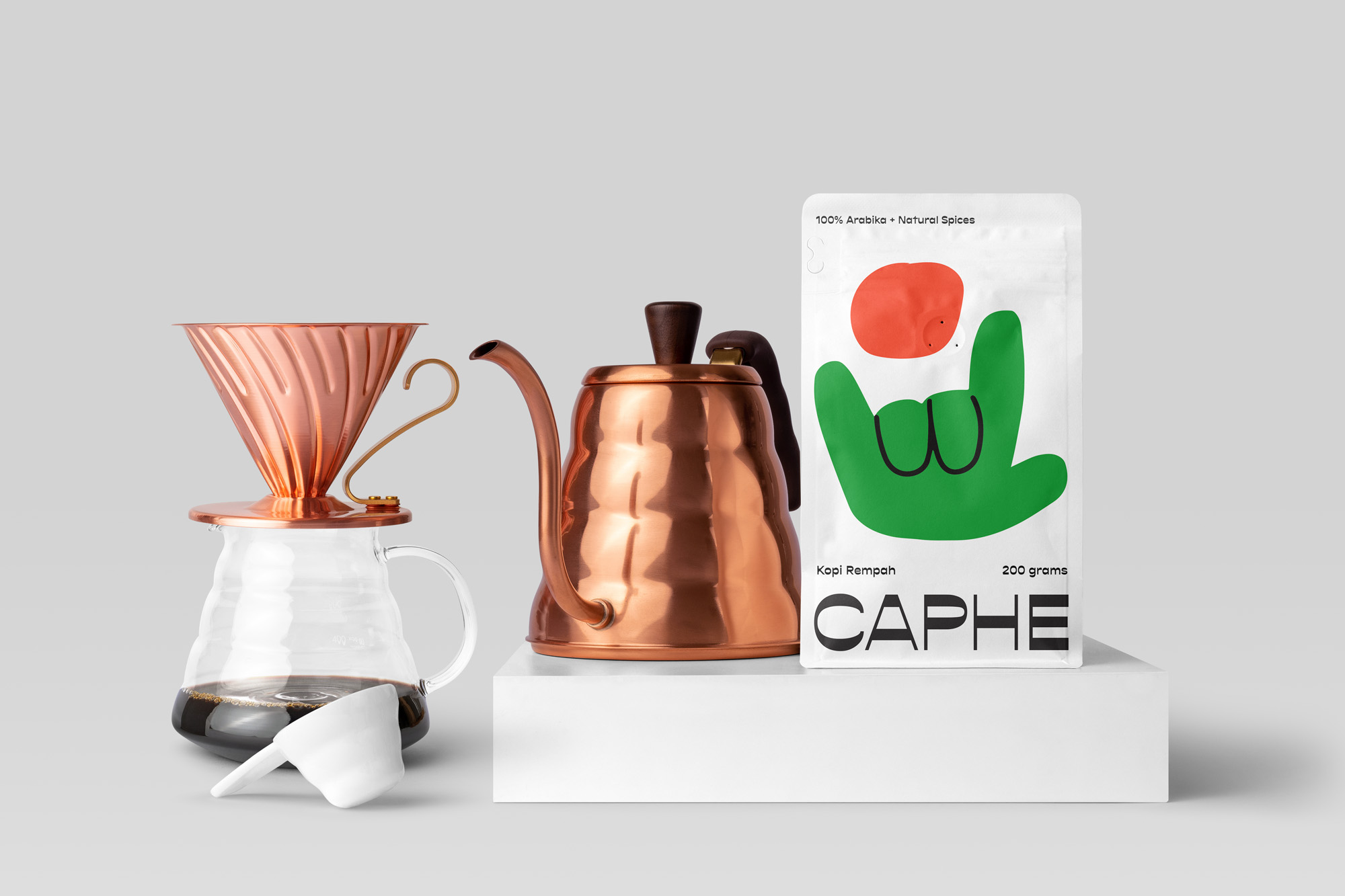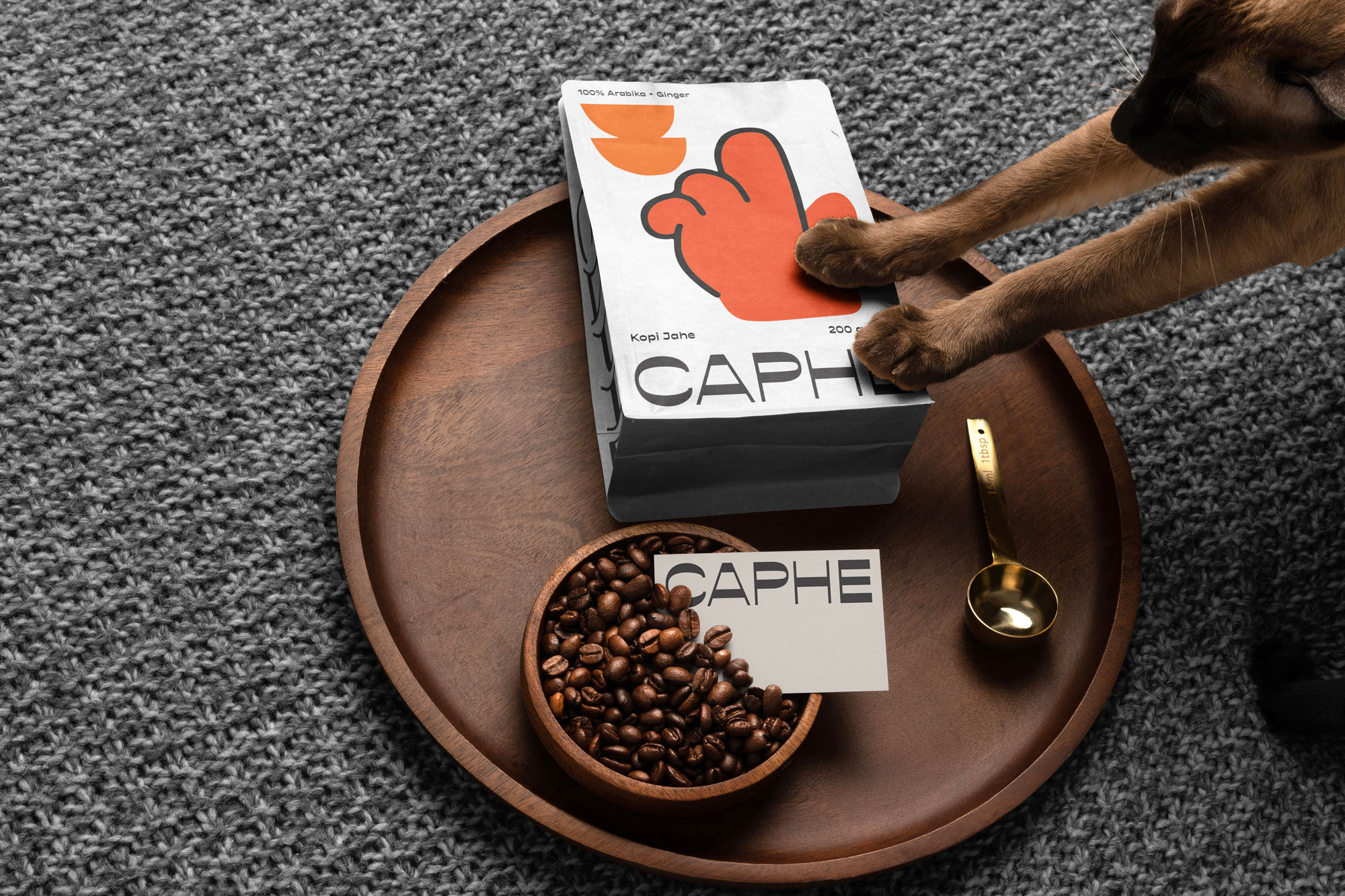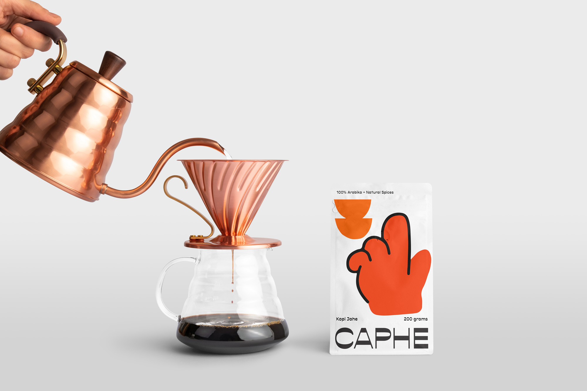 我們選擇Opposit作為Caphe的字體,這種字體是獨(dú)一無(wú)二的,字母的每個(gè)字符上都有粗而細(xì)的筆畫(huà)。在包裝設(shè)計(jì)中,我們?cè)噲D拋開(kāi)以咖啡為基礎(chǔ)的包裝設(shè)計(jì)思想。與大多數(shù)咖啡設(shè)計(jì)不同,姜汁咖啡自動(dòng)地以姜汁插圖為特色,這太普通和無(wú)聊了。我們?cè)O(shè)計(jì)了一個(gè)手勢(shì)的插圖,作為享受咖啡的滿(mǎn)足感的標(biāo)志。除了是包裝上的一個(gè)身份和設(shè)計(jì),這個(gè)插圖也是一個(gè)附屬于品牌的圖像。它與眾不同,獨(dú)一無(wú)二,引人注目。