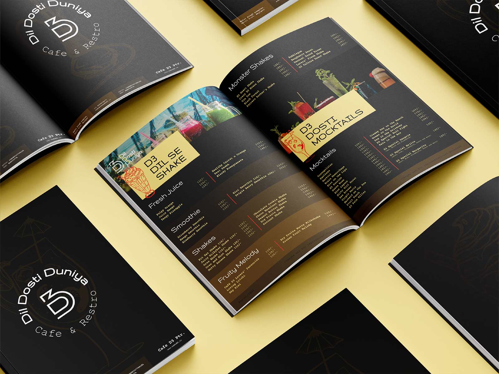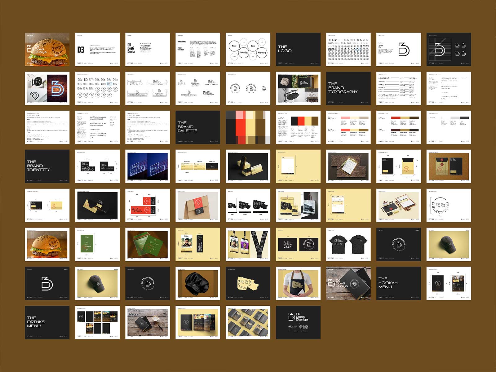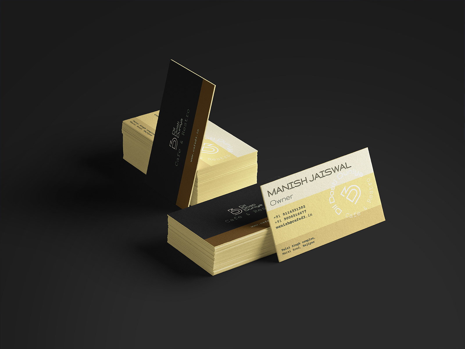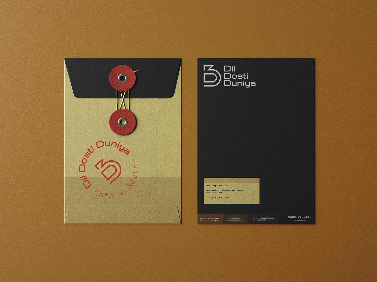 對于將大量印刷的文具,如信箋抬頭和發(fā)票,我們保留白色作為基色。對于名片、信封和邀請函等單幅印刷文具,我們使用 D 黑色和不同色調(diào)的 Dosti 黃色和 Duniya Brown 作為基色的組合。我們采用浮雕印刷技術(shù),結(jié)合紅色徽標(biāo)印章,提供手工制作的精致用餐體驗。我們進一步使用不同色調(diào)的Dosti Yellow對不同的信息進行分組,同時為文具提供標(biāo)志性的視覺品牌標(biāo)識。