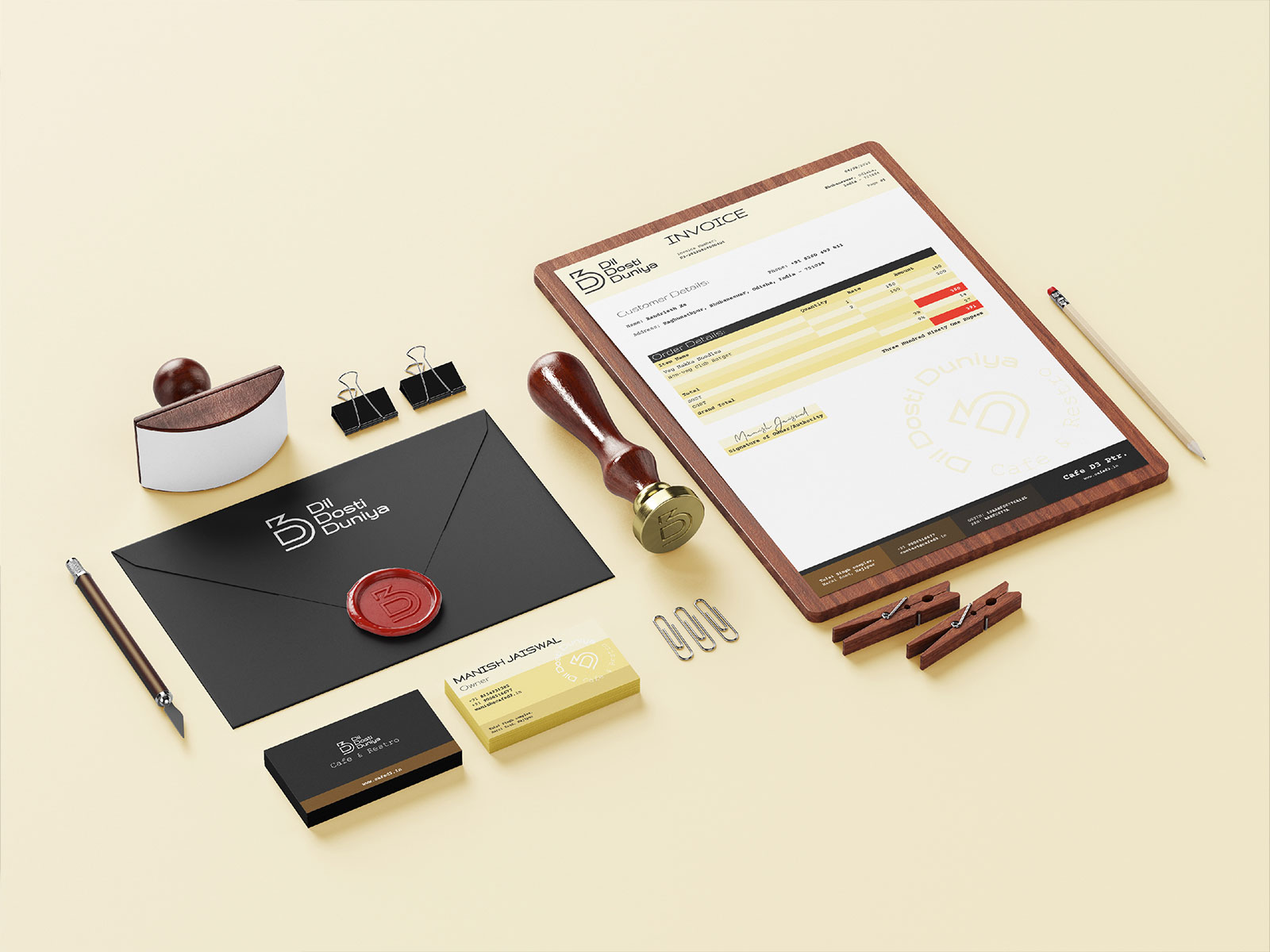 我們?yōu)镃afe D3設(shè)計的品牌設(shè)計中,其文具包括名片,信頭,發(fā)票,法律信封,半信封和邀請卡。