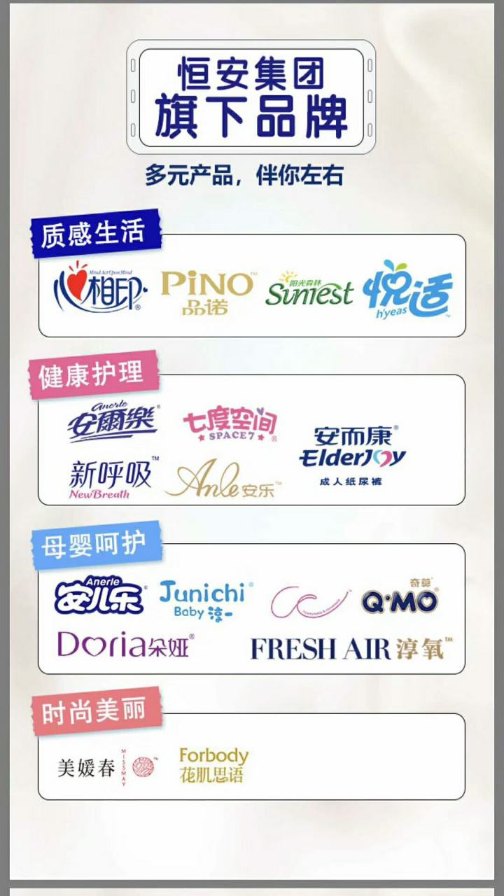 品牌介紹:恒安集團(tuán)創(chuàng)立于1985年,經(jīng)營(yíng)領(lǐng)域涉及婦幼衛(wèi)生用品、紙類(lèi)產(chǎn)品、化妝及護(hù)膚類(lèi)產(chǎn)品等,是國(guó)內(nèi)最大的婦女衛(wèi)生巾和嬰兒紙尿褲專(zhuān)業(yè)生產(chǎn)企業(yè),擁有固定資產(chǎn)二十多億元,員工一萬(wàn)余人,在全國(guó)17個(gè)省、市、自治區(qū),投資設(shè)立40多家生產(chǎn)公司,在全國(guó)設(shè)立40余家分公司以及200多個(gè)銷(xiāo)售團(tuán)隊(duì)、上萬(wàn)人業(yè)務(wù)人員遍布全國(guó)城市、鄉(xiāng)村,提供優(yōu)質(zhì)服務(wù),保證公司產(chǎn)品對(duì)市場(chǎng)需求做出快速反應(yīng)。 恒安國(guó)際集團(tuán)有限公司于1998年在香港成功上市。