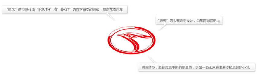橢圓的形狀象征著源源不斷的能量感,更像是一個(gè)永遠(yuǎn)追求進(jìn)步和卓越的靈魂,“鵬鳥(niǎo)”的頭部造型設(shè)計(jì),由東南昂首朝上,表現(xiàn)出振翅欲飛的態(tài)勢(shì),表現(xiàn)出企業(yè)旺盛、強(qiáng)烈的進(jìn)取心及能力,“鵬鳥(niǎo)”造型整體由“SOUTH”和”EAST”的首字母變幻組成,意指東南汽車。