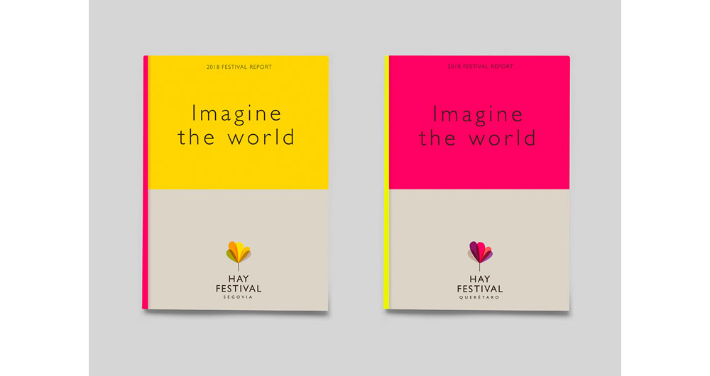 “Hay Festival”以無襯線字體出現(xiàn)在樹旁或樹下的堆疊線條中,以大寫字母排列,威勒稱其為“經(jīng)典”,帶有“烏托邦式的感覺”。核心標(biāo)識(shí)的每一根樹枝都被設(shè)置成不同的顏色,包括紫色、粉色、橙色和黃色。該標(biāo)志以多種顏色出現(xiàn),代表了該節(jié)日分支的不同地點(diǎn),比如西班牙塞戈維亞姐妹節(jié)的不同黃色色調(diào),以及秘魯阿雷基帕的一系列紫色。威勒表示,logo選用了“充滿活力”的調(diào)色板,背景采用了“更平靜”的色調(diào),用以鼓舞和娛樂人們。